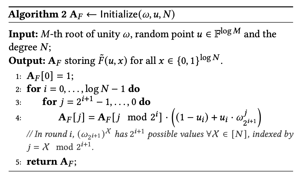 여기서 모든 수식 정리를 다루지 않겠지만, 논문에서 수식 정리를 통해 $\tilde{F}(u, x) = \prod^{logM - 1}_{i=0}((1-u_i)+ u_i \cdot \omega^X_{2_{i+1}}$임을 보이게 됩니다. 또한 이렇게 수식이 정리가 되면, 아래 있는 Algorithm2를 통해 $O(M + N)$의 time complexity 에 해당 $A_F$를 만들어내게 됩니다.